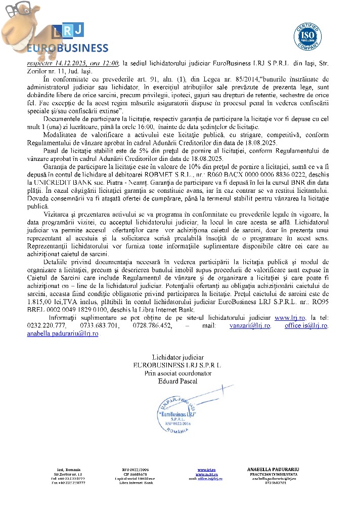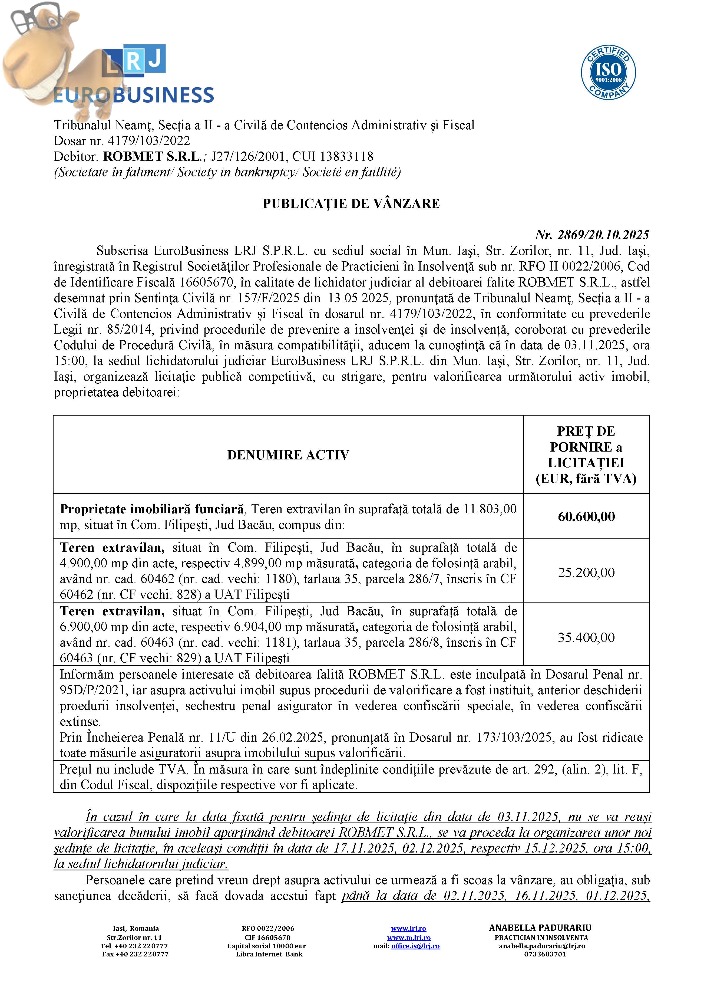 Subscrisa Euro Business LRJ, in calitate de lichidator judiciar, vinde prin licitatie publica: Proprietate imobiliară funciară, Teren extravilan în suprafață totală de 11.803,00 mp, situat în Com. Filipești, Jud Bacău, compus din:Teren extravilan, situat în Com. Filipești, Jud Bacău, în suprafață totală de 4.900,00 mp din acte, respectiv 4.899,00 mp măsurată, categoria de folosință arabil, având nr. cad. 60462 (nr. cad. vechi: 1180), tarlaua 35, parcela 286/7, înscris în CF 60462 (nr. CF vechi: 828) a UAT Filipești și Teren extravilan, situat în Com. Filipești, Jud Bacău, în suprafață totală de 6.900,00 mp din acte, respectiv 6.904,00 mp măsurată, categoria de folosință arabil, având nr. cad. 60463 (nr. cad. vechi: 1181), tarlaua 35, parcela 286/8, înscris în CF 60463 (nr. CF vechi: 829) a UAT Filipești. Relatii pe www.lrj.ro, in publicatia de vanzare sau telefonic de luni pana vineri intre orele 10:00 - 16:00.