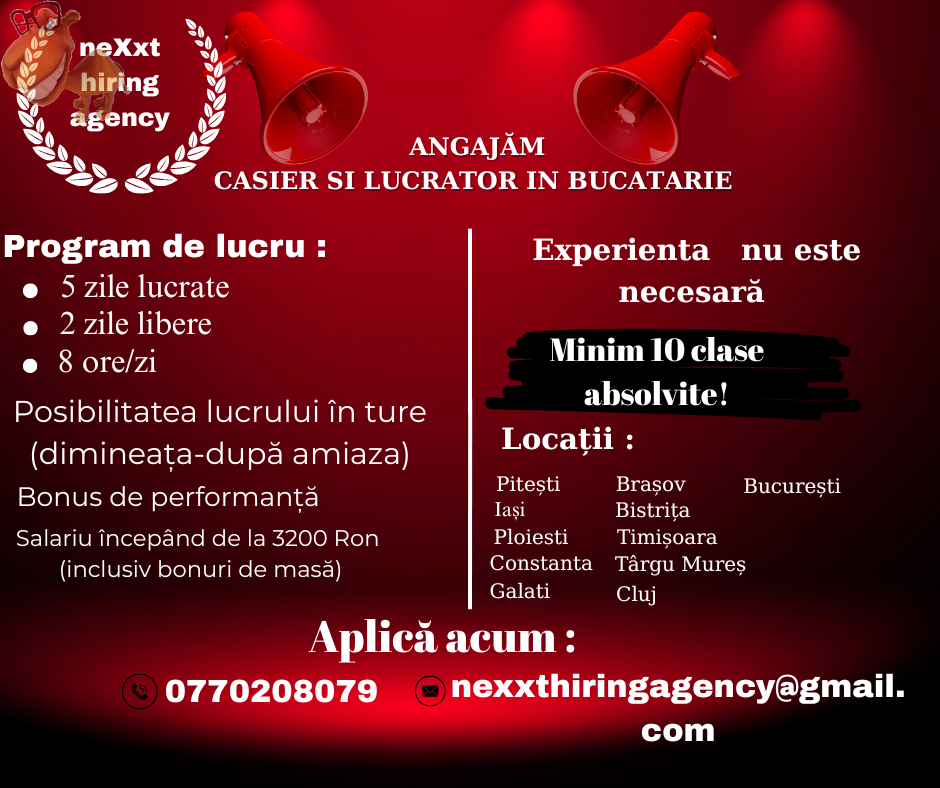 ANGAJĂM URGENT: CASIER & LUCRĂTOR BUCĂTĂRIE – VINO ÎN ECHIPA NOASTRĂ!