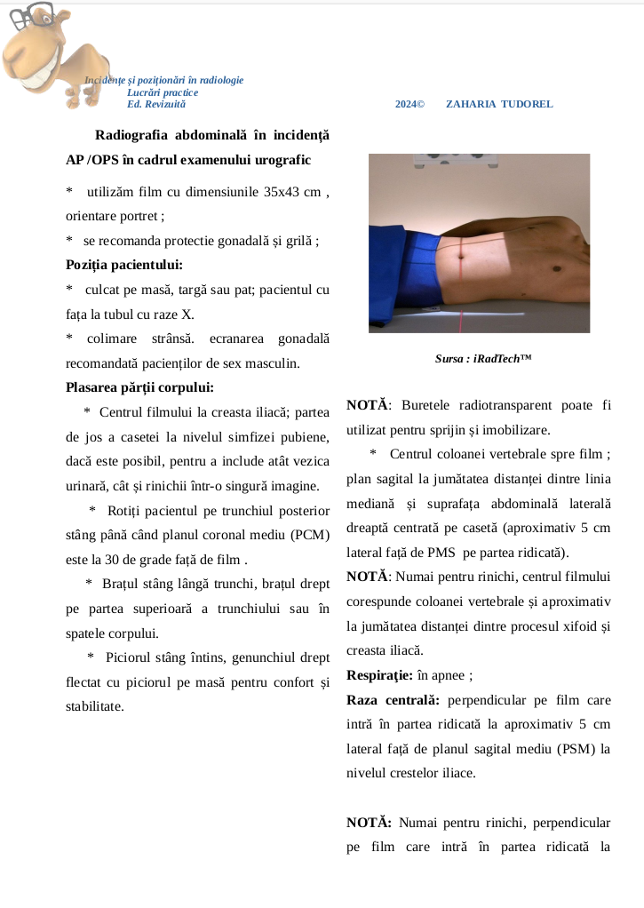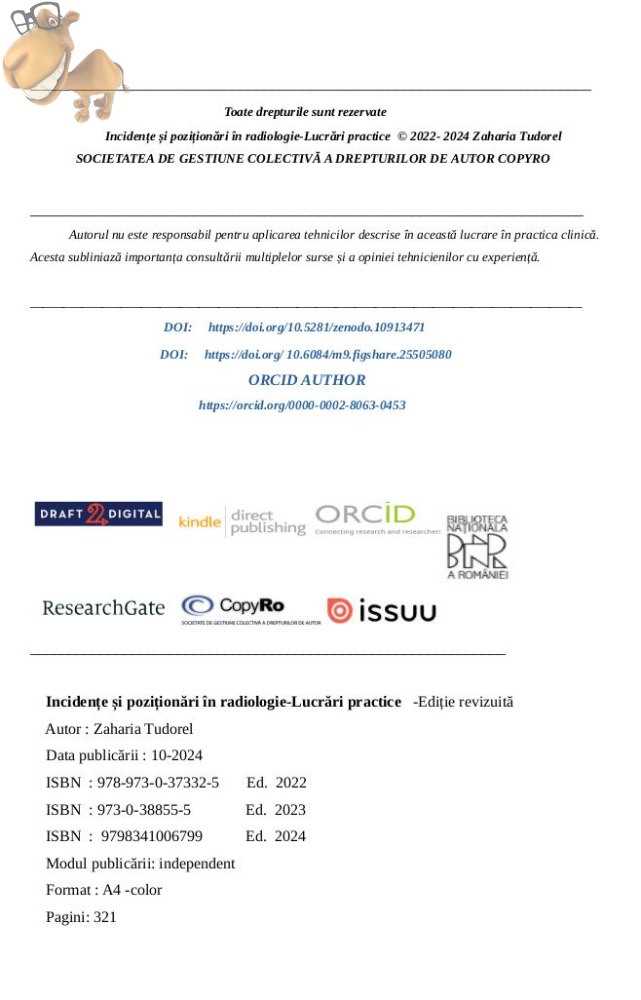 -este un ghid de imagistica traditionala destinat tehnicienilor, axat pe pozitionari si incidente. Lucrarea a evoluat de-a lungul timpului, fiind publicata initial in 2022, cu un tiraj de 100 de pagini, distribuita gratuit. In 2023, a fost extinsa prin integrarea cu "Anatomie radiologica", rezultand un tratat captivant de imagistica traditionala. In 2024, autorul a decis sa revizuiasca si sa reformateze lucrarea, prezentandu-ne versiunea finala a tratatului. Aceasta este o oportunitate rara de a detine un astfel de tratat, avand in vedere ca nu exista lucrari similare pe piata romaneasca. Autorul incurajeaza cititorii sa exploreze si lucrarile altor autori si sa aplice tehnicile de imagistica cu responsabilitate. Lucrarea de fata a fost publicata in mai multe limbi, printre care se numara spaniola, hindi, araba si chineza, avand o mare cerere in randul specialistilor din domeniu.