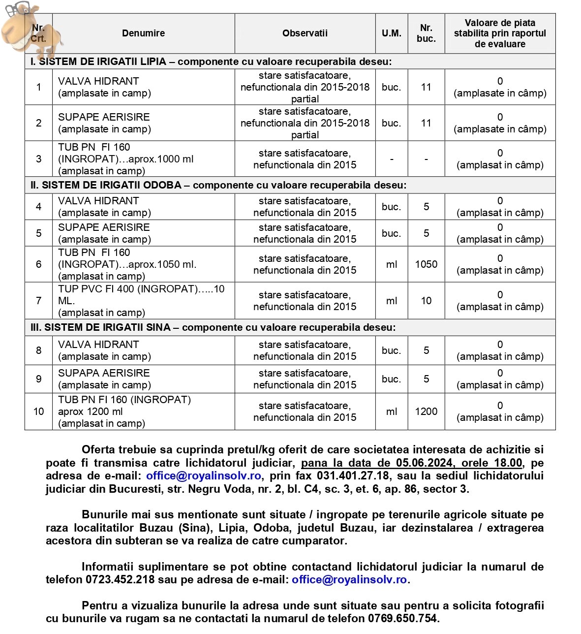 Lista detaliata cu bunurile poate fi solicitata lichidatorului judiciar prin e-mail.