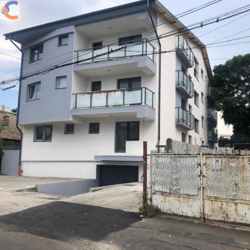 Cladire cu un design modern, ferestre mari, terase generoase, balcoane din sticla.