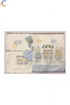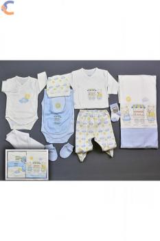 Un set complet de hainute pentru nou-nascuti ce va fi foarte folositor, mai ales ca bebelusul necesita schimbare permanenta. Setul vine in varianta albastra pentru baietei. In ce priveste continutul acestuia, el vine cu scutecel cu ursuleti, doua body-uri, unul cu maneca scurta si unul cu maneca lunga, cu doua bluze, una simpla si una cu imprimeu ursulet, pantaloni cu botosei, manusi de protectie ca sa nu se zgarie bebelusul din greseala, plus o pereche de sosetele, caciulita si bavetica. Produsele sunt realizate din bumbac 100% .Setul este ambalat elegant intr-o cutiuta eleganta si vine la pachet si cu punga cadou.