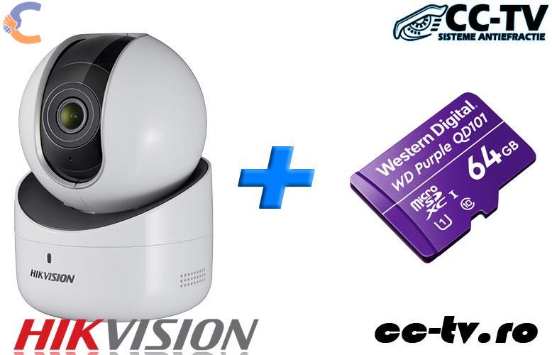 Camera MiniPT IP WI-FI de la HIKVISION, rezolutie HD 2MP (1920x1080), echipata cu lentila de 2.0mm unghi de vizualizare de 136°, microfon si speaker integrat ce ce permite comunicare audio bidirectionala, SD-card 64GB (inclus), distanta IR pe timp de noapte pana la 5M - 10M, cursa rotire: stanga-dreapta 0° ~ 355°, sus-jos: -10° ~ 85°.