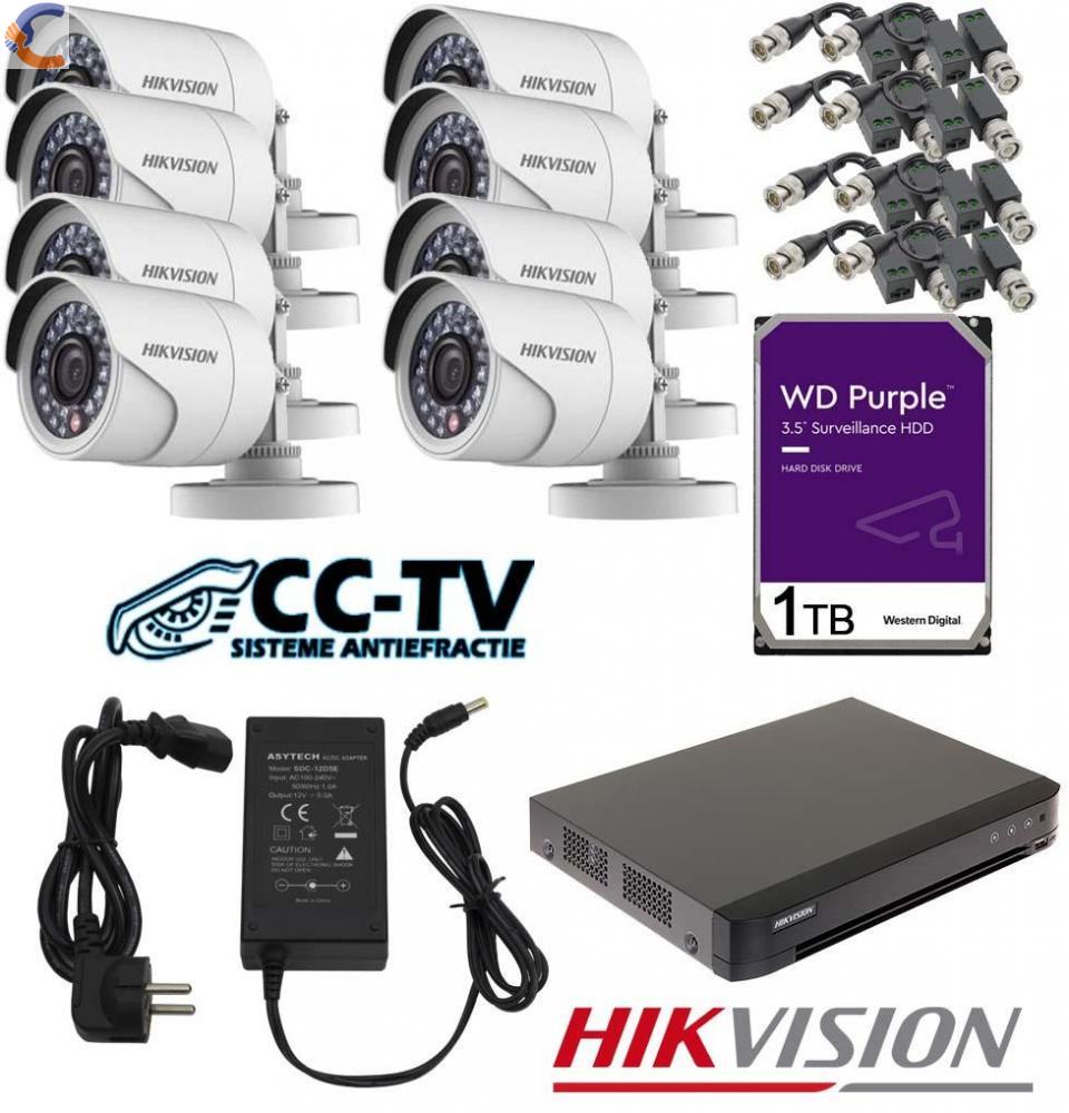 Kit complet de supraveghere video cu montaj format din 8 camere HikVision de 2Mp, Lentila 2.8 mm, asigura unghi vizual de 103°, DVR, alimentare, video balun, HDD 1 TB.