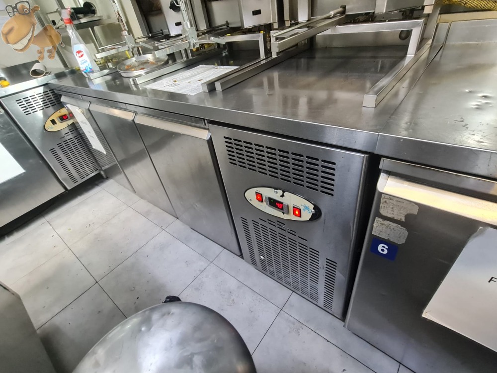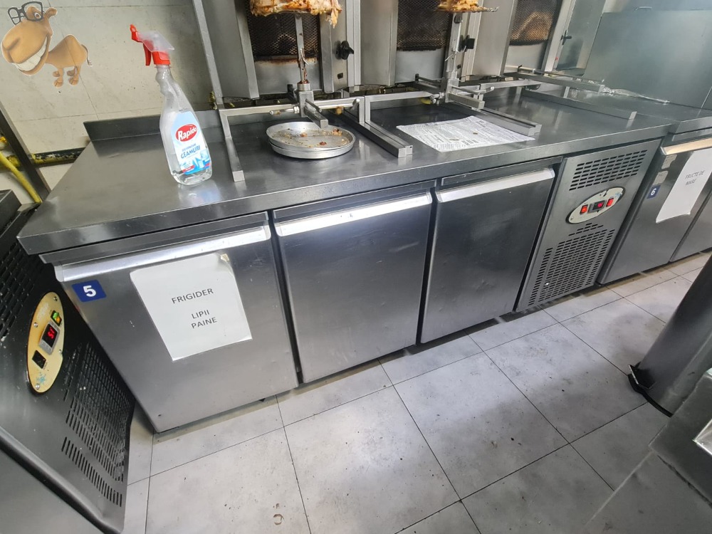 Mese frigorifice cu 3 usi, dimensiune 187*90*85 cm-3900 lei, 200*52*85 cm -3900 lei, masa congelare 200*70*85 cm cu 3 usi -4500 lei, masa frigorifica pentru pizza cu blat de granit- 4500 lei, aparate gyros cu motor jos cu 4 arzatoare -1700 lei,
