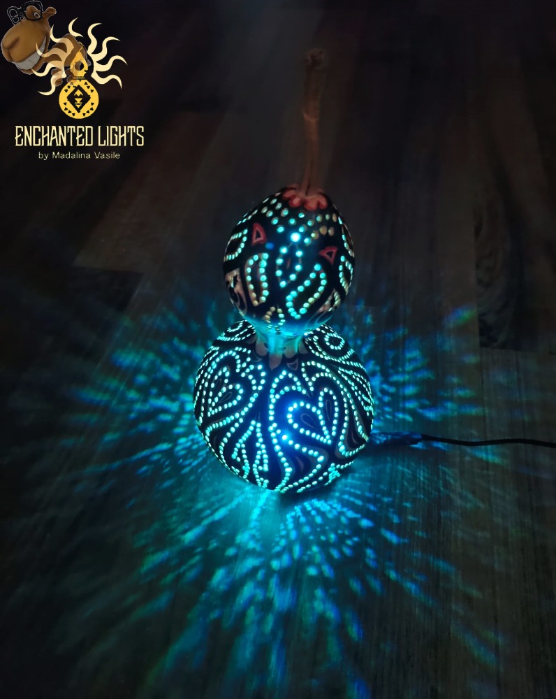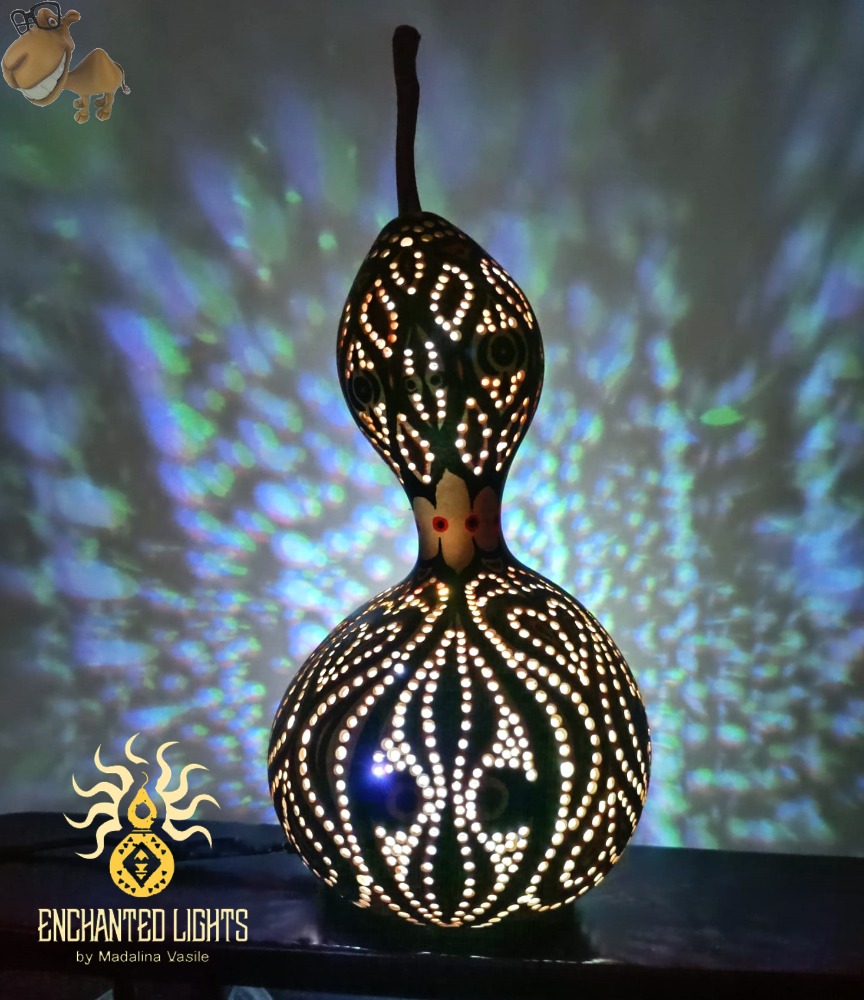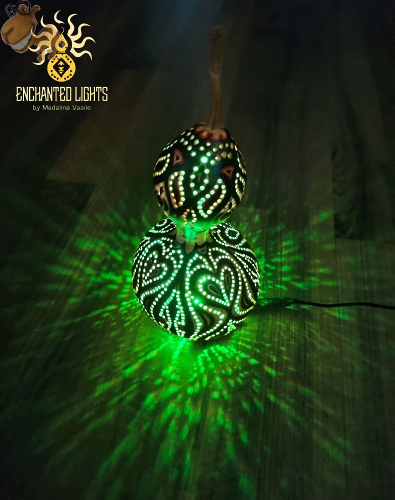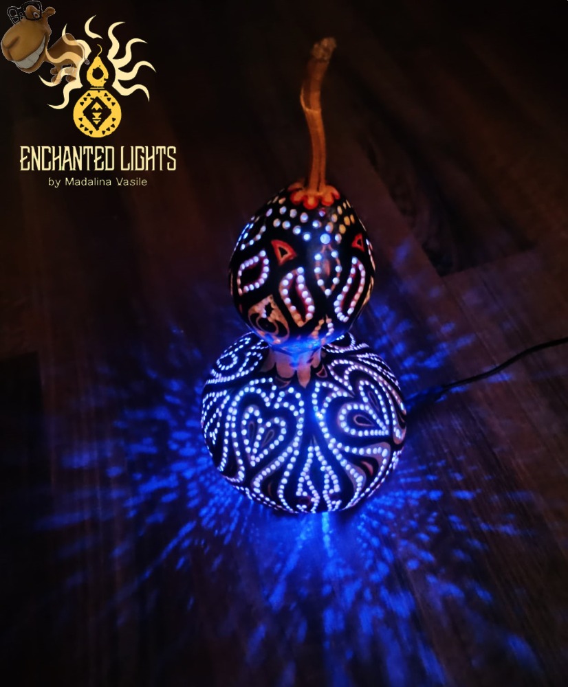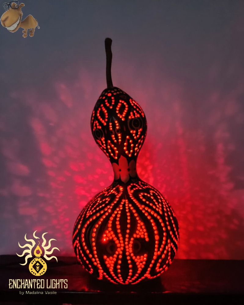 Lampa realizata din tartacuta sculptata si pictata - cu telecomanda. Aceasta lampă este o operă de artă, sculptată și pictată manual pentru a aduce magie în casa dumneavoastră.
