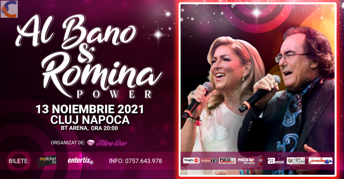 Concert Albano & Romina Power- 13 Noiembrie 2021 Cluj-Napoca- BT Arena- Cuplul italian cel mai iubit de publicul internațional "Al Bano&Romina Power" își reia "LIVE TOUR 2021", întrerupt în 2020. O ocazie specială de a putea asculta noul album și toate cele mai mari succese internaționale ale Al Bano&Romina Power. Biletele puse în vânzare pe circuitele online: myticket.ro – entertix.ro (organizator MiraDue) info: 0757643978