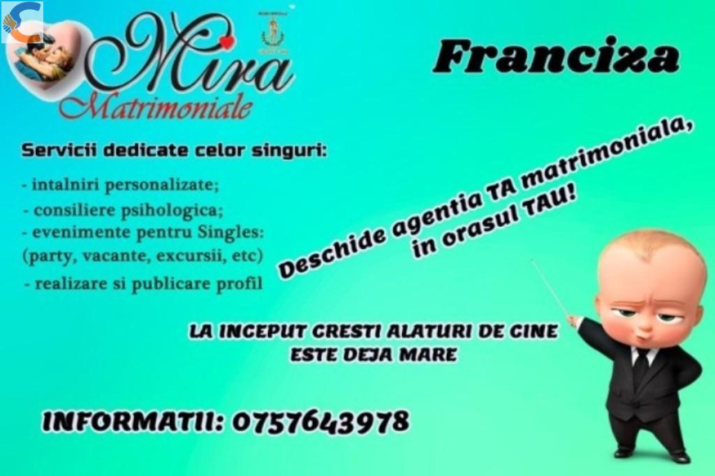 Franciza Matrimoniala Mira – In general, ceea ce caracterizeaza fiinta umana este dimensiunea sa relationala: - raportul uman, confruntarea si armonia cu celalalt. De aceea serviciul unei agentii matrimoniale este din ce in ce mai cerut si devine chiar indispensabil. Serviciile noastre sunt dedicate celor singuri: organizam intalniri personalizate, evenimente pentru oameni singuri, dornici de o relatie stabila, dornici de a-si mari dimensiunea relationala. Daca doresti si tu sa ai propria ta agentie, unde ii ajuti pe oameni pe drumul complicat ce numim iubirea, suna acum pentru o programare! 0757643978 nu sms