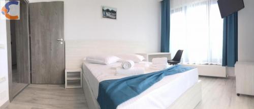 Dormitoarele sunt prevăzute cu paturi king-size, Smart TV-uri, aparate de aer conditionat, precum și cu câte un dulap și un birou.