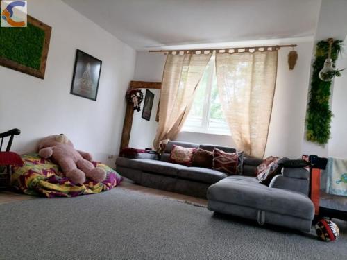 Mansarda = Open space+ dormitor+zona depozitare, curte cu trandafiri lavanda, zmeura, mur, pomi fructiferi (visini, caisi, pruni ) si vedere la padure.