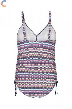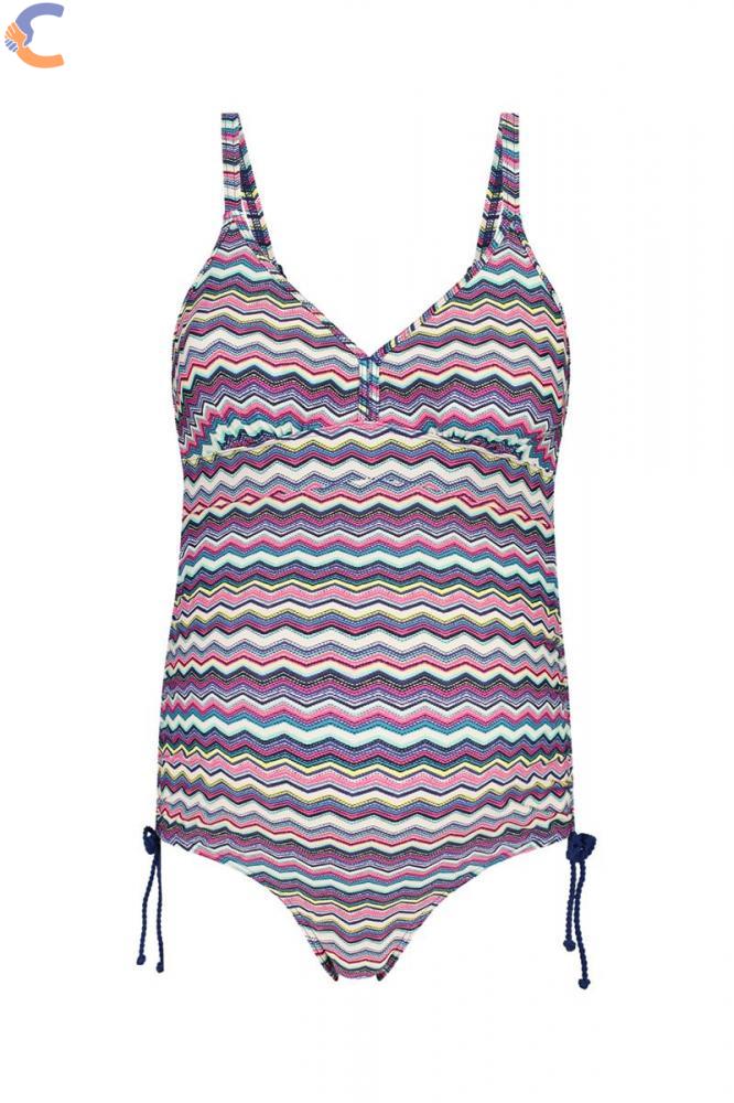 Design-ul vine intr-un model retro in zig-zag in culori de vara. Costumul de baie este confectionat dintr-un material cu uscare rapida, curelele din laterale pot fi ajustate si partea de jos poate fi largita. Cupele preformate ofera o fermitate suplimentara si sunt detasabile.