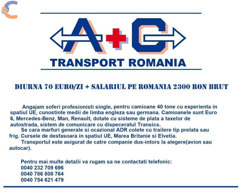 Angajam soferi profesionisti diurna 70 euro/zi –singur pe camion, plus salariul pe Romania 2300 lei/brut.