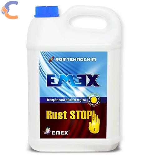 Solutia pentru Indepartarea Ruginii EMEX RUST STOP este un produs profesional, pe baza de acizi slabi si tari, saruri sulfurate, agenti tensioactivi si solventi organici, realizat special atat pentru curatarea in totalitate a ruginii sau tunderului de pe suprafetele metalice cat si pentru tratarea si pregatirea speciala, prin fosfatare, a acestora in vederea vopsirii sau galvanizarii.