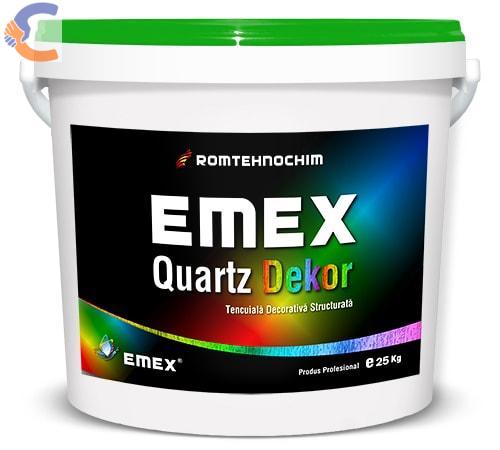 Tencuiala Decorativa EMEX QUARTZ DEKOR este un produs profesional pe baza de copolimeri acrilo-stirenici, aditivi si fileri, cu adaos de cuart si granule de marmura de diverse marimi, destinat finisarii decorative superioare a tencuielilor, cu aspect final de scoarta de copac. Are o aderenta foarte buna la suport si rezistenta mare la intemperii, fara deterioarea aspectului. Contine biocizi ecologici, de ultima generatie, lucru ce ii confera o buna rezistenta la fungi si mucegaiuri. Se fabrica in orice nuanta conform cartelei NCS, sau poate fi colorata cu paste de colorare.