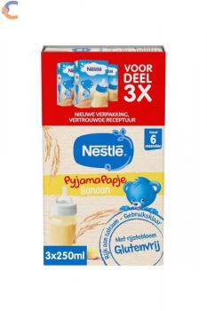 Acest produs pentru bebelusi, import Olanda este un terci delicios gata preparat si contine faina de orez. Poate fi folosit in biberon, cana de invatare sau in farfurie. Ideal inainte de culcare! Nestlé Pyjamapapje cu banane este bogat in calciu, fier, faina de orez fara gluten.