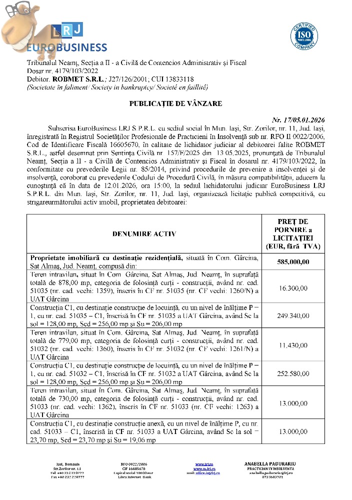 Subscrisa Euro Business LRJ, in calitate de lichidator judiciar, vinde prin licitatie publica: Proprietate imobiliară cu destinație rezidențială, situată în Com. Gârcina, Sat Almaș, Jud. Neamț, compusă din: Teren intravilan, situat în Com. Gârcina, Sat Almaș, Jud. Neamț, în suprafață totală de 878,00 mp, categoria de folosință curți - construcții, având nr. cad. 51035 (nr. cad. vechi: 1359), înscris în CF nr. 51035 (nr. CF vechi: 1260/N) a UAT Gârcina, Construcția C1, cu destinație construcție de locuință, cu un nivel de înălțime P + 1, cu nr. cad. 51035 – C1, înscrisă în CF nr. 51035 a UAT Gârcina, având Sc la sol = 128,00 mp, Scd = 256,00 mp și Su = 206,00 mp, Teren intravilan, situat în Com. Gârcina, Sat Almaș, Jud. Neamț, în suprafață totală de 779,00 mp, categoria de folosință curți - construcții, având nr. cad. 51032 (nr. cad. vechi: 1360), înscris în CF nr. 51032 (nr. CF vechi: 1261/N) a UAT Gârcina, Construcția C1, cu destinație construcție de locuință, cu un nivel de înălțime P + 1, cu nr. cad. 51032 – C1, înscrisă în CF nr. 51032 a UAT Gârcina, având Sc la sol = 128,00 mp, Scd = 256,00 mp și Su = 206,00 mp, Teren intravilan, situat în Com. Gârcina, Sat Almaș, Jud. Neamț, în suprafață totală de 730,00 mp, categoria de folosință curți - construcții, având nr. cad. 51033 (nr. cad. vechi: 1362), înscris în CF nr. 51033 (nr. CF vechi: 1263) a UAT Gârcina, Construcția C1, cu destinație construcție anexă, cu un nivel de înălțime P, cu nr. cad. 51033 – C1, înscrisă în CF nr. 51033 a UAT Gârcina, având Sc la sol = 23,70 mp, Scd = 23,70 mp și Su = 19,06 mp, Teren intravilan, situat în Com. Gârcina, Sat Almaș, Jud. Neamț, în suprafață totală de 845,00 mp, categoria de folosință arabil, amenajare iaz, având nr. cad. 51031 (nr. cad. vechi: 1361), înscris în CF nr. 51031 (nr. CF vechi: 1262/N) a UAT Gârcina, respectivTeren intravilan, situat în Com. Gârcina, Sat Almaș, Jud. Neamț, în suprafață totală de 368,00 mp, categoria de folosință drum, care deservește întreaga proprietate și este considerat cotă indiviză pentru fiecare lot de teren, având nr. cad. 51034 (nr. cad. vechi: 1358), înscris în CF nr. 51034 (nr. CF vechi: 1259/N) a UAT Gârcina, fără valoare comercială. Informăm persoanele interesate că debitoarea falită ROBMET S.R.L. este inculpată în Dosarul Penal nr. 95D/P/2021, iar asupra activului imobil supus procedurii de valorificare a fost instituit, anterior deschiderii proedurii insolvenței, sechestru penal asigurator în vederea confiscării speciale, în vederea confiscării extinse. Prin Încheierea Penală nr. 11/U din 26.02.2025, pronunțată în Dosarul nr. 173/103/2025, au fost ridicate toate măsurile asiguratorii asupra imobilului supus valorificării. Informațiile vor fi detaliate în Caietul de sarcini. Relatii pe www.lrj.ro, in publicatia de vanzare sau telefonic de luni pana vineri intre orele 10:00 - 16:00.