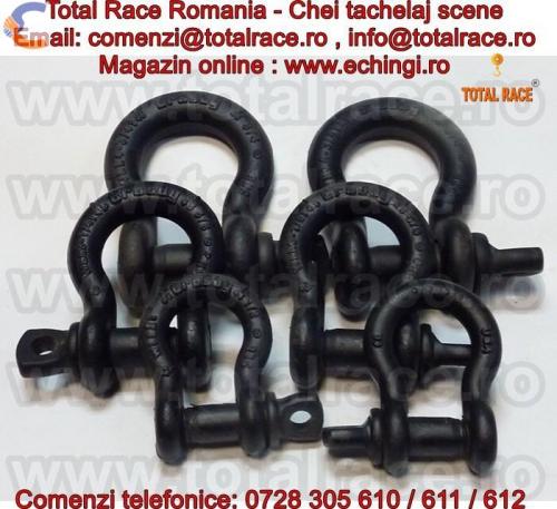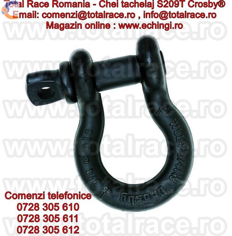 Total Race comercializeaza : chei de tachelaj pentru scena/ teatru / circ / concerte , chei de tachelaj model S 209T tip omega marca Crosby, cheie tachelaj cu bolt filetat . Chei de tachelaj cu capacitati intre 1 tona si 4,75 tone. Gambetii sunt in conformitate cu EN 13889 si indeplinesc cerintele de performanta ale Fed. Spec. RR-C271D tip IVA, grad A, Clasa 2, ASME B30.26. Cheile de tachelaj au factor de siguranta: MBL = 6 x WLL (Sarcina maxima de lucru) , shackles Forjat - Calit si Temperat, cu bolt aliat , material otel aliat , capacitatea stantata permanent.