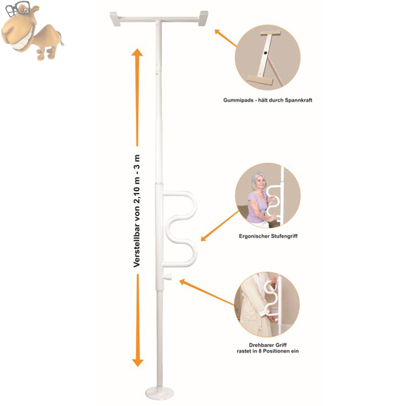 Ajutorul pentru ridicare poate fi folosit, de exemplu, ca ajutor pentru toaleta sau cada in baie. Sau puteti plasa stalpul ca ajutor in picioare langa patul din dormitor sau langa scaunele din zona de zi sau de luat masa.