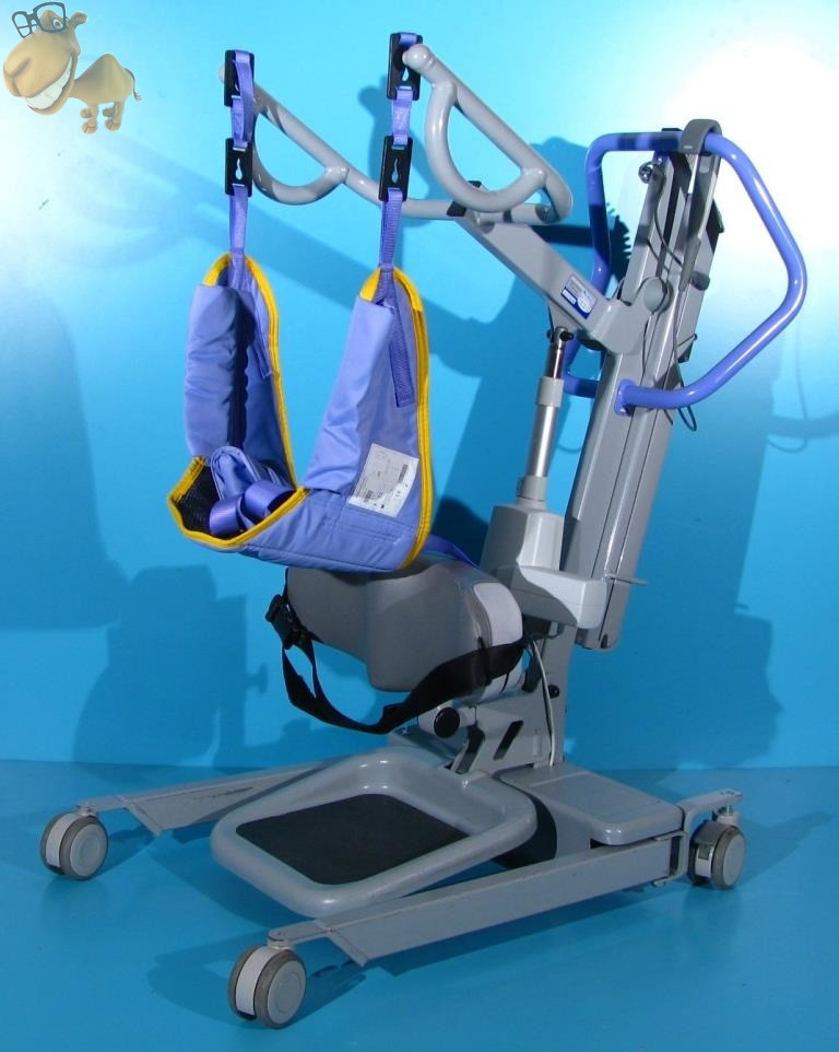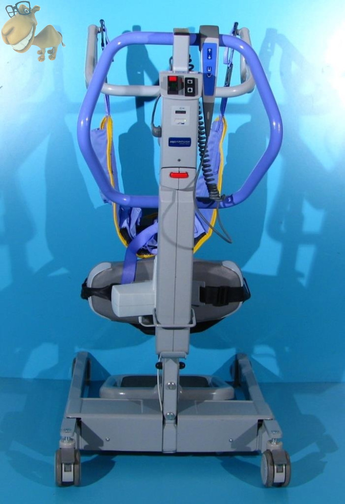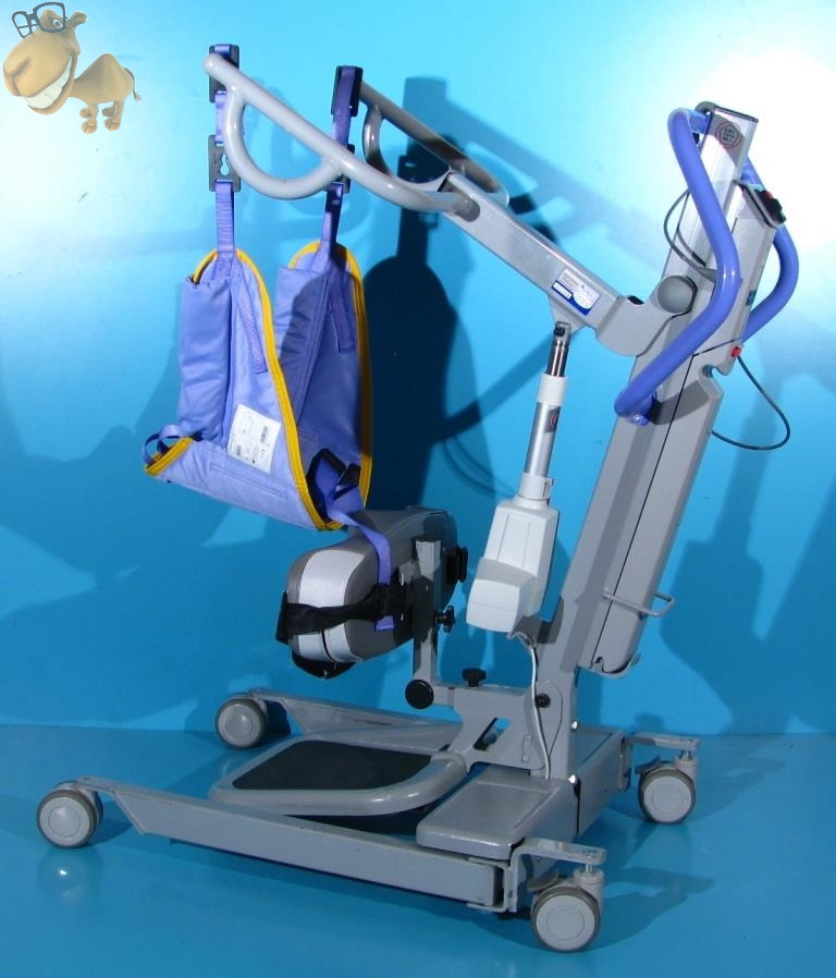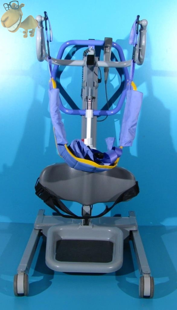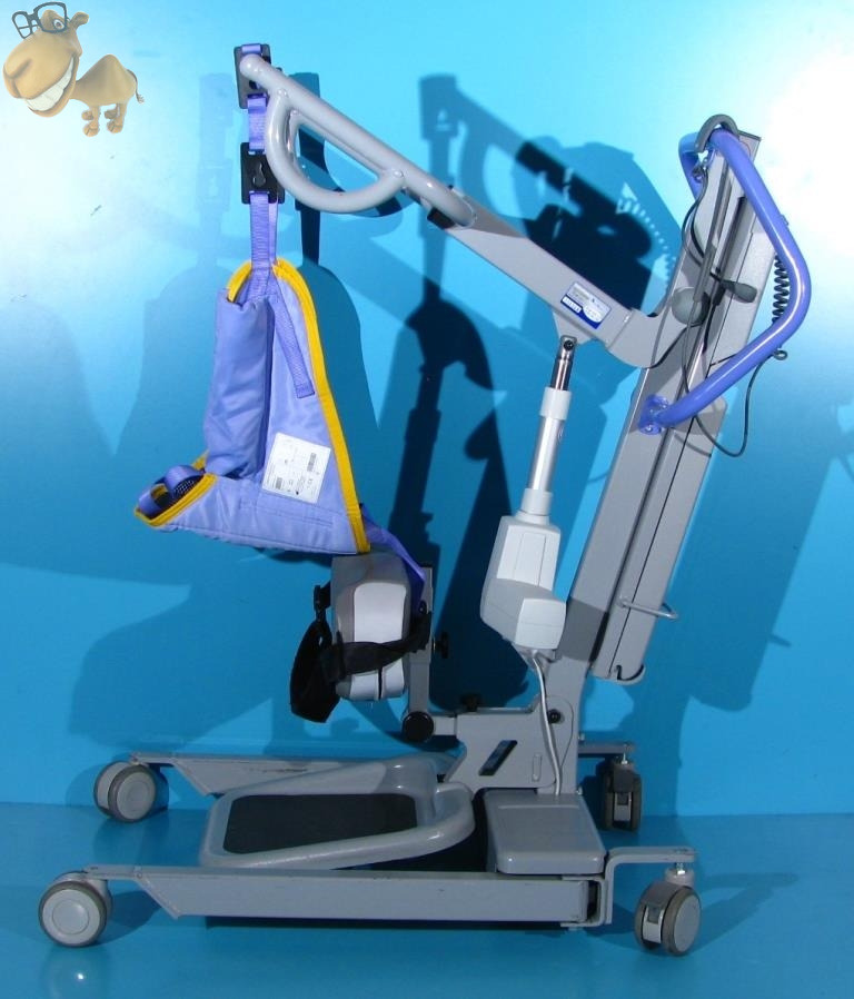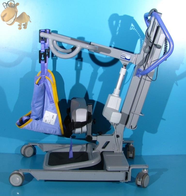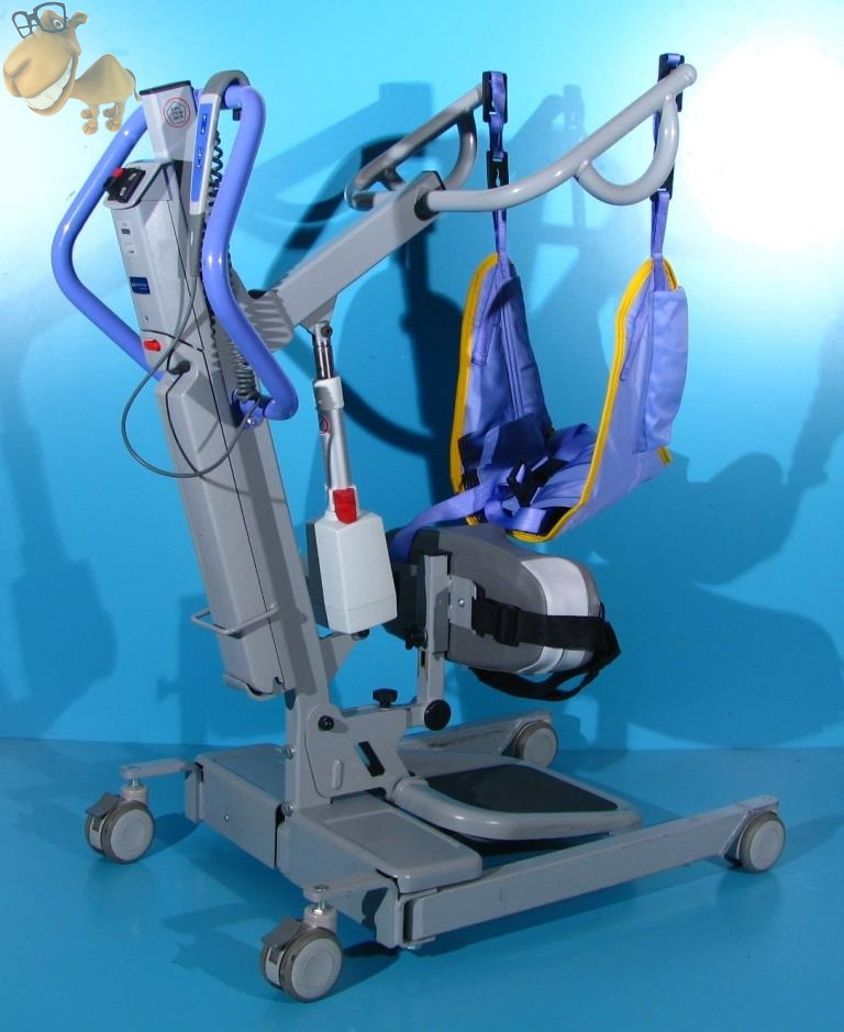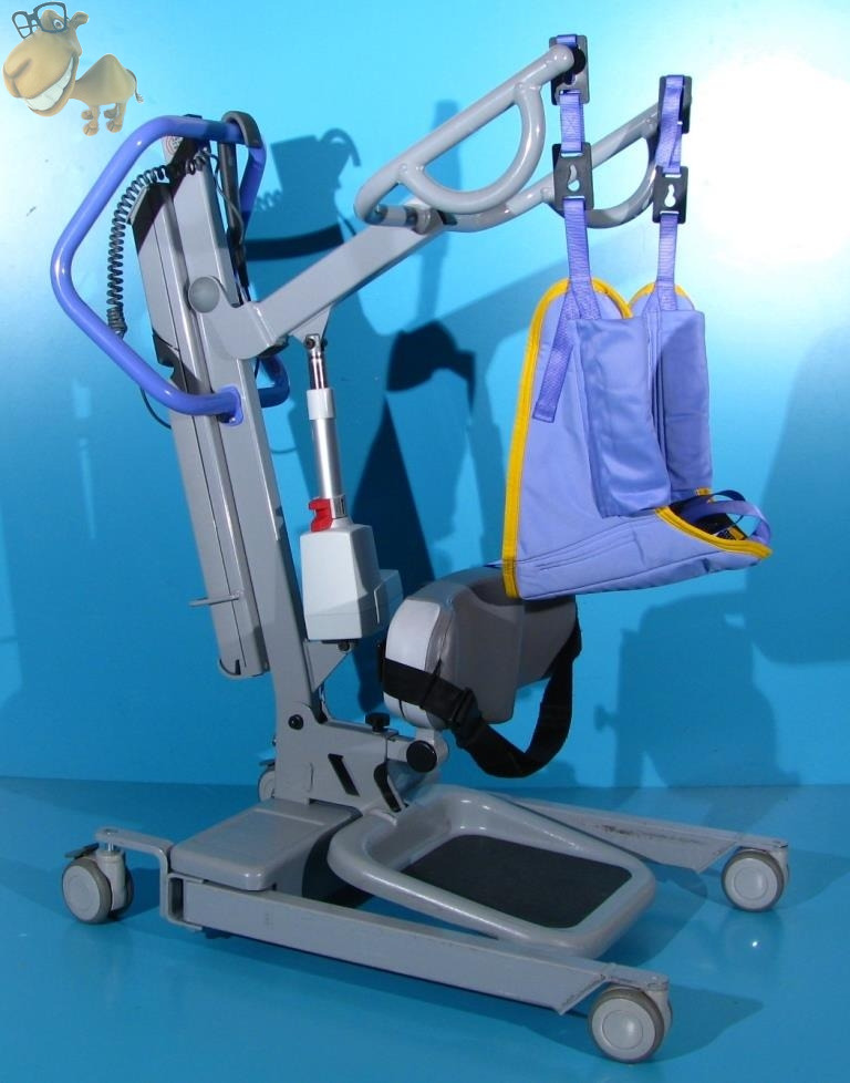 Acest dispozitiv de ridicat si transportat pacienti este dotat cu telecomanda care actioneaza bratul de ridicare si distanta intre picioare, si ham cu sistem de siguranta.