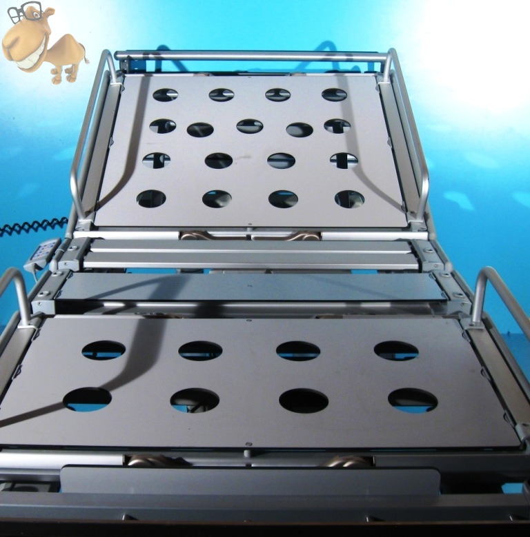 Pat ATI cu 4 functii actionate electric cu ajutorul a doua telecomenzi, una pentru pacient si un panou de comanda pentru cadrele medicale situata la capatul patului: sectiunea spate, sectiunea coapse si sectiunea gamba, inaltimea patului sus – jos.