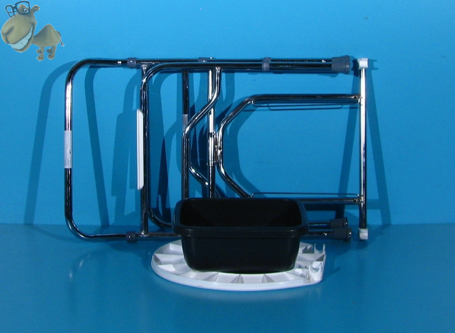 Scaunul cu toaleta are cadrul din otel cromat.