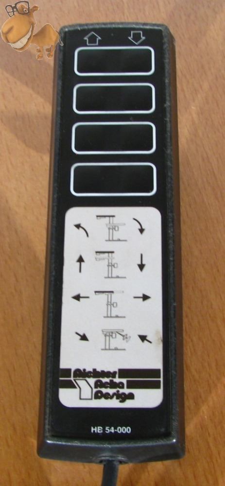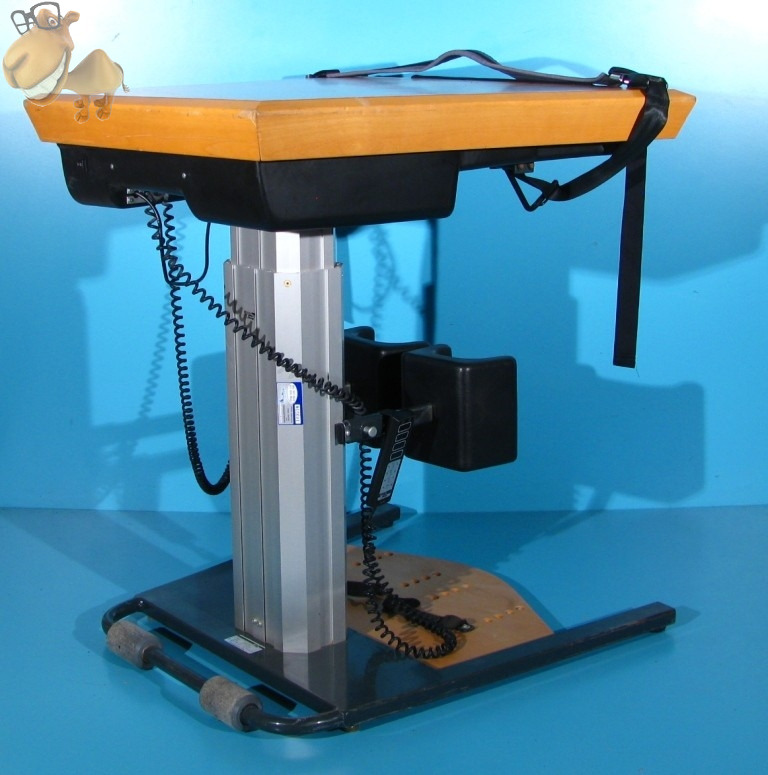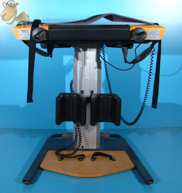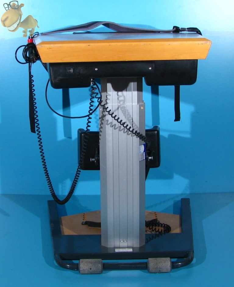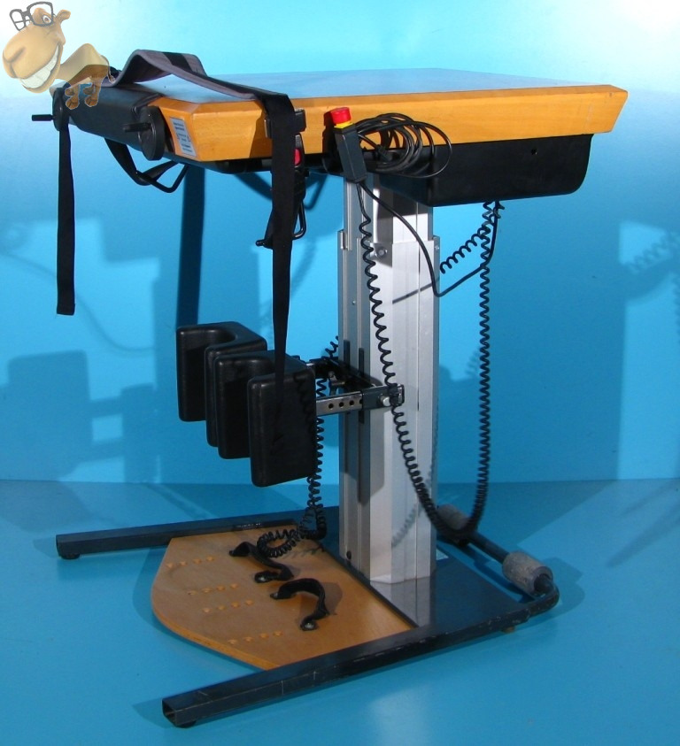 Functiile electrice actionate din telecomanda pemit: deplasarea mesei fata/spate 40 cm, ridicarea/asezarea pacientului pe scaun (deplasarea mesei in fata in acelasi timp cu verticalizarea).