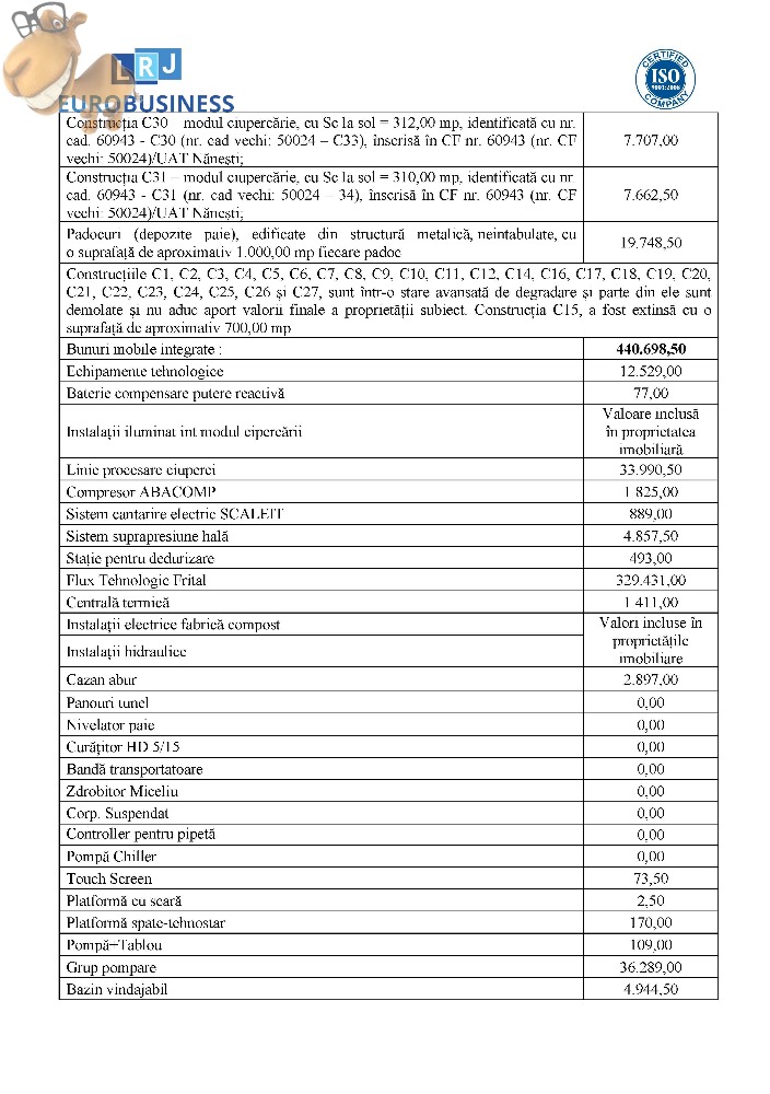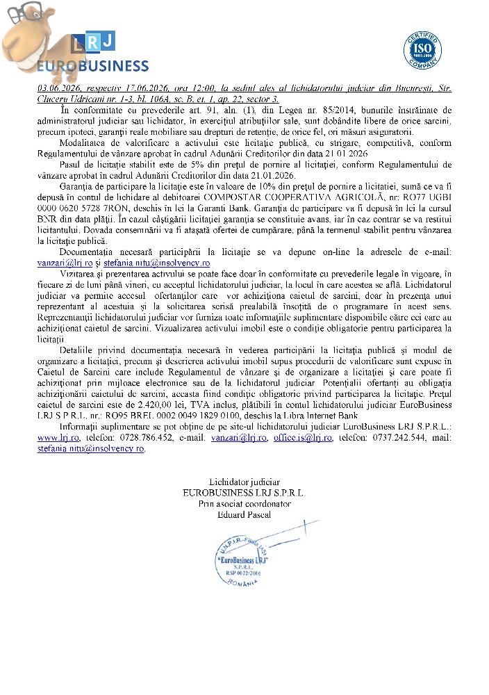 Subscrisa Euro Business LRJ, in calitate de lichidator judiciar, vinde prin licitatie publica :Proprietate de tip agroindustrial ”Construcții și teren”, cu destinația „Fabrică de compost și ciupercărie”, situată în Sat Nănești, Com. Nănești, Jud. Vrancea, înscrisă în CF nr. 60943 (nr. CF vechi: 50024)/UAT Nănești, Jud. Vrancea, compusă din teren, construcții și bunuri mobile integrate.Relatii pe www.lrj.ro, in publicatia de vanzare sau telefonic de luni pana vineri intre orele 10:00 - 16:00.